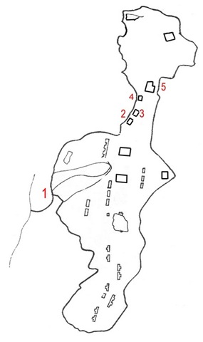 जैसे जैसे इस चिट्ठे पर जानकारी बढती चली जायगी वैसे वैसे इस नक्शे में वह जानकारी एक एक करके भरी जायगी. अत: इस नक्शे को फिर से जरूर देखें. इस समय जिन स्थलों को संख्या से प्रदर्शित किया गया है उनका नाम नीचे दिया गया हैं. इन में से हर स्थान का वर्णन एवं चित्र अन्यत्र दिया गया है. याद रखें कि किले की कुल लम्बाई दो किलोमीटर के आसपास है एवं इसमें बहुत सारे इलाके कई कारणों से लोगों की पहुंच से बाहर है. जिन इलाकों में हम पहुंच सके थे, उनके वर्णन के लिये कई महीने लगेंगे.